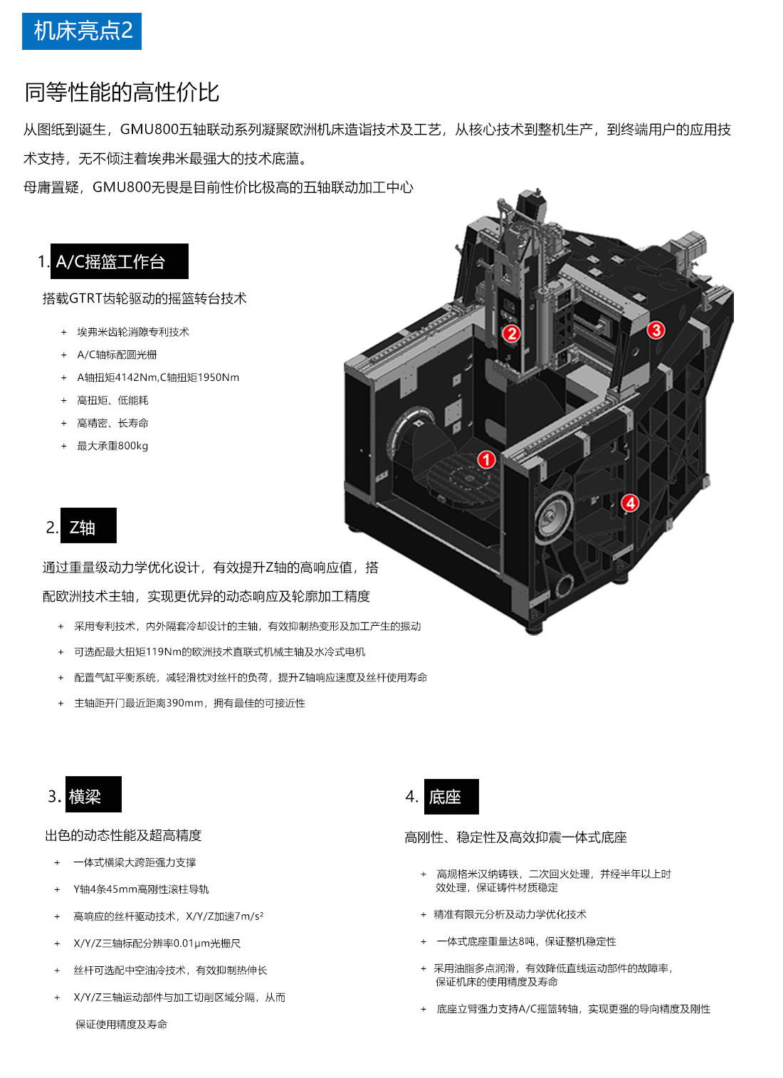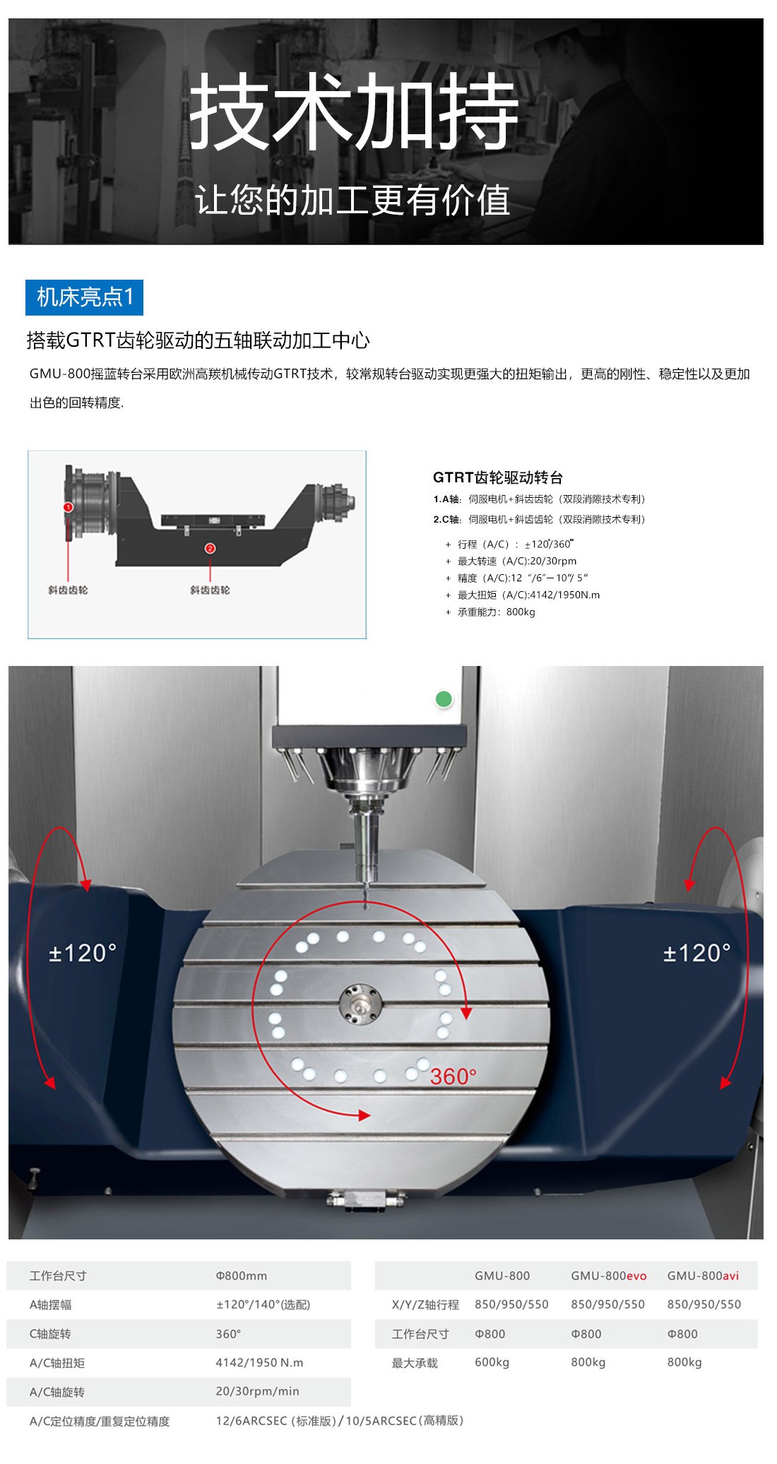 GMU-800高剛性五軸聯(lián)動加工中心技術(shù)規(guī)格名稱單位GMU-800GMU-800evoGMU-800avi系統(tǒng)(控制單元)SIEMENS-840DSIEMENS840D/HEIDENHAIN-iTNC640HEIDENHAIN-iTNC640X/Y/Z軸行程mm850/950/550850/950/550850/950/550A/C軸行程度±120/360±120/360±120/360主軸端面至工作臺距離(A軸位于0度位置時)mm180-730180-730180-730工作臺尺寸MmΦ800Φ800Φ800最大承重kg600800800主軸主軸(標配)主軸最高轉(zhuǎn)速/錐柄rpm15000HSK-A6320000HSK-A6312000HSK-A63主軸功率(S1/S6-40%)KW18/2229/3615.5/21.7扭矩(S1/S6-40%)N.m57/7069.9/87.585/119進給系統(tǒng)X/Y/Z軸快速位移m/min40/40/40-32/32/3240/40/40-32/32/3220/20/20最大切削進給率m/min202010A/C軸快進速度rpm20/3020/3020/30定位精度/重復(fù)定位精度(GB17421.22000)X/Ymm0.008/0.0060.007/0.0040.007/0.004Zmm0.007/0.0050.006/0.0040.006/0.004A/CARCSEC12/610/510/5自動換刀系統(tǒng)刀具數(shù)Pcs26T/32T/48T26T/32T/48T26T/32T/48T換刀時間(刀-刀)sec12s12s12s刀具最大長度mm300300300刀具最大直徑/相鄰無刀mmΦ80/Φ120Φ80/Φ120Φ80/Φ120刀具最大重量kg888機床尺寸機床總高mm350035003500占地面積(長X寬)mm24800×39004800×39004800×3900機床凈重kg170001700017000電力需求kw607060